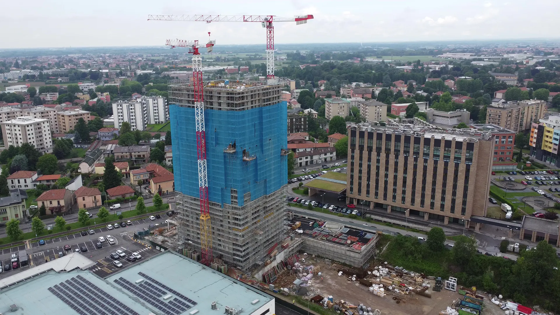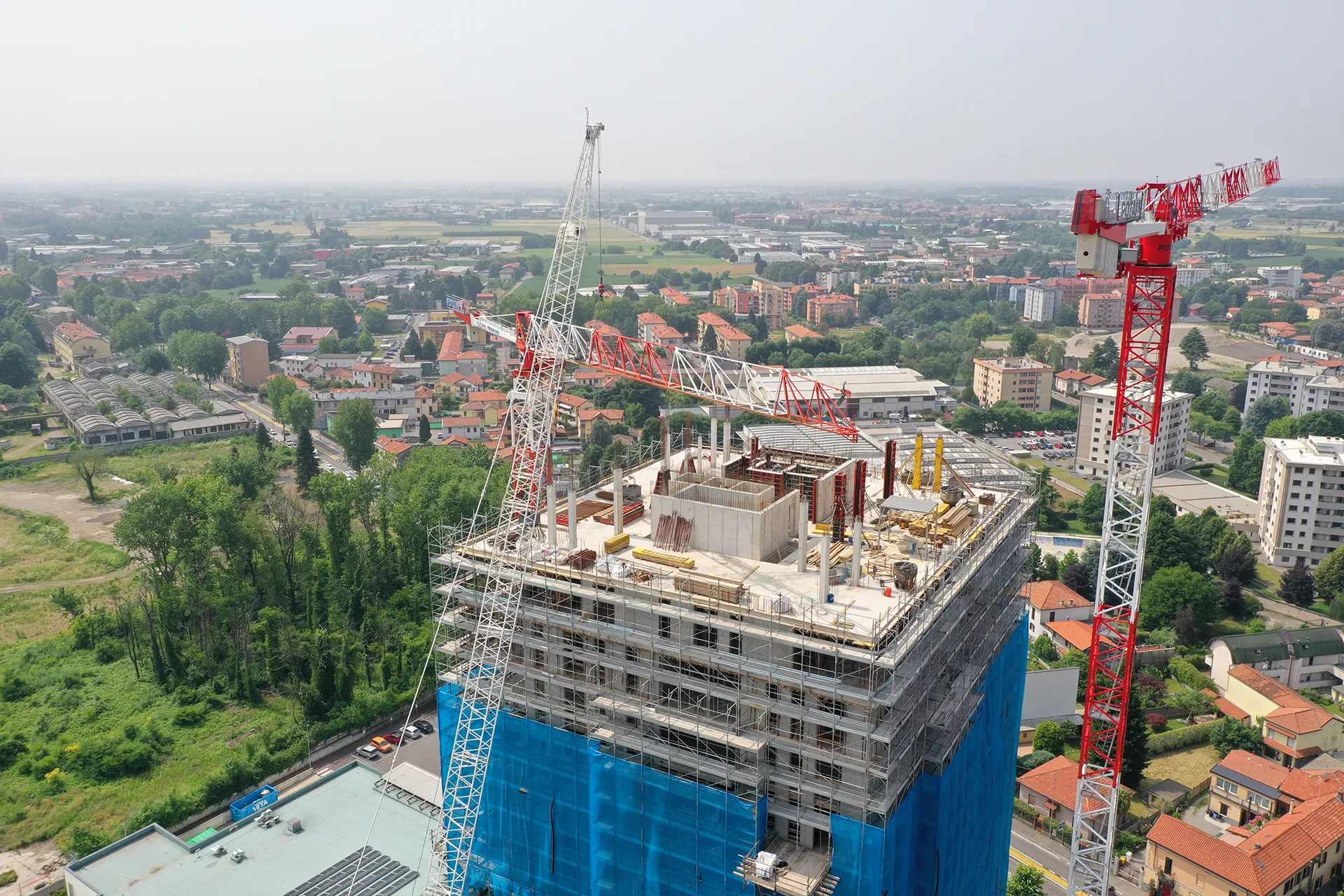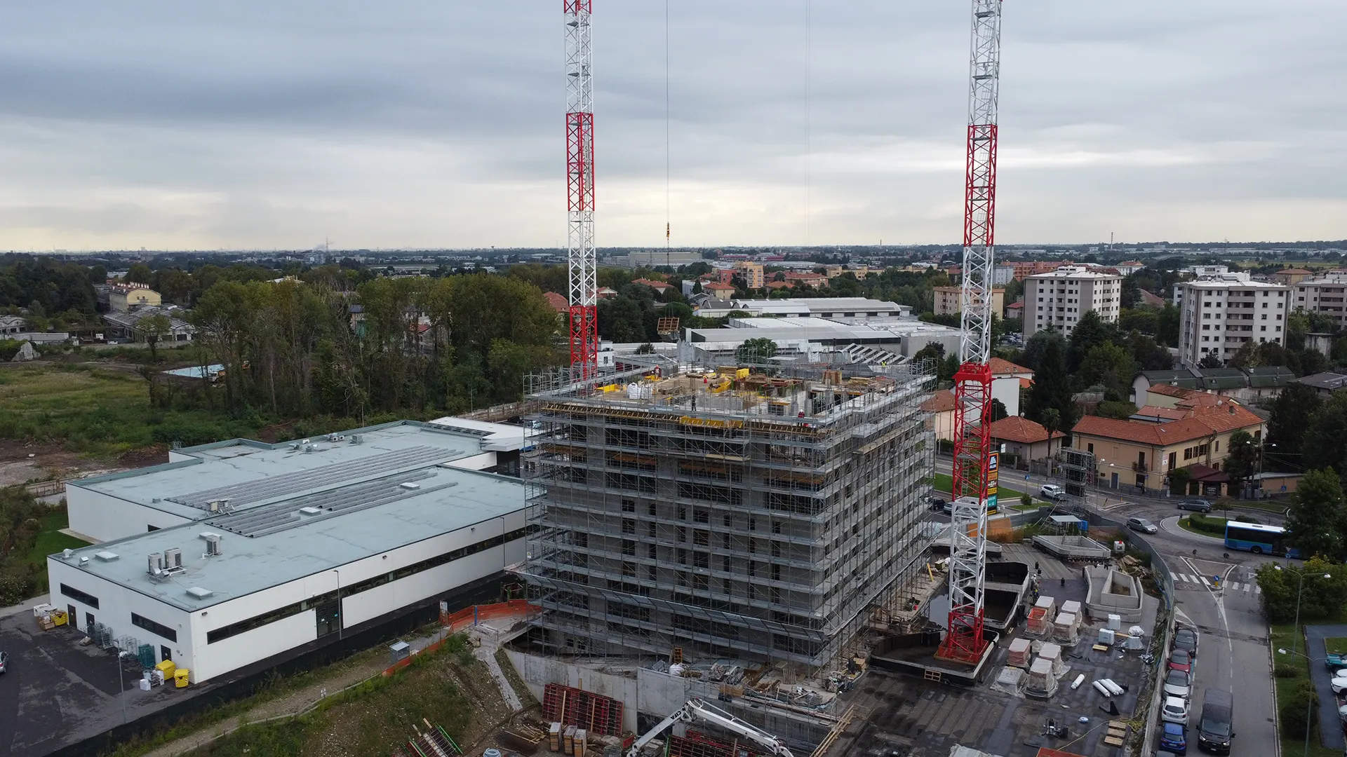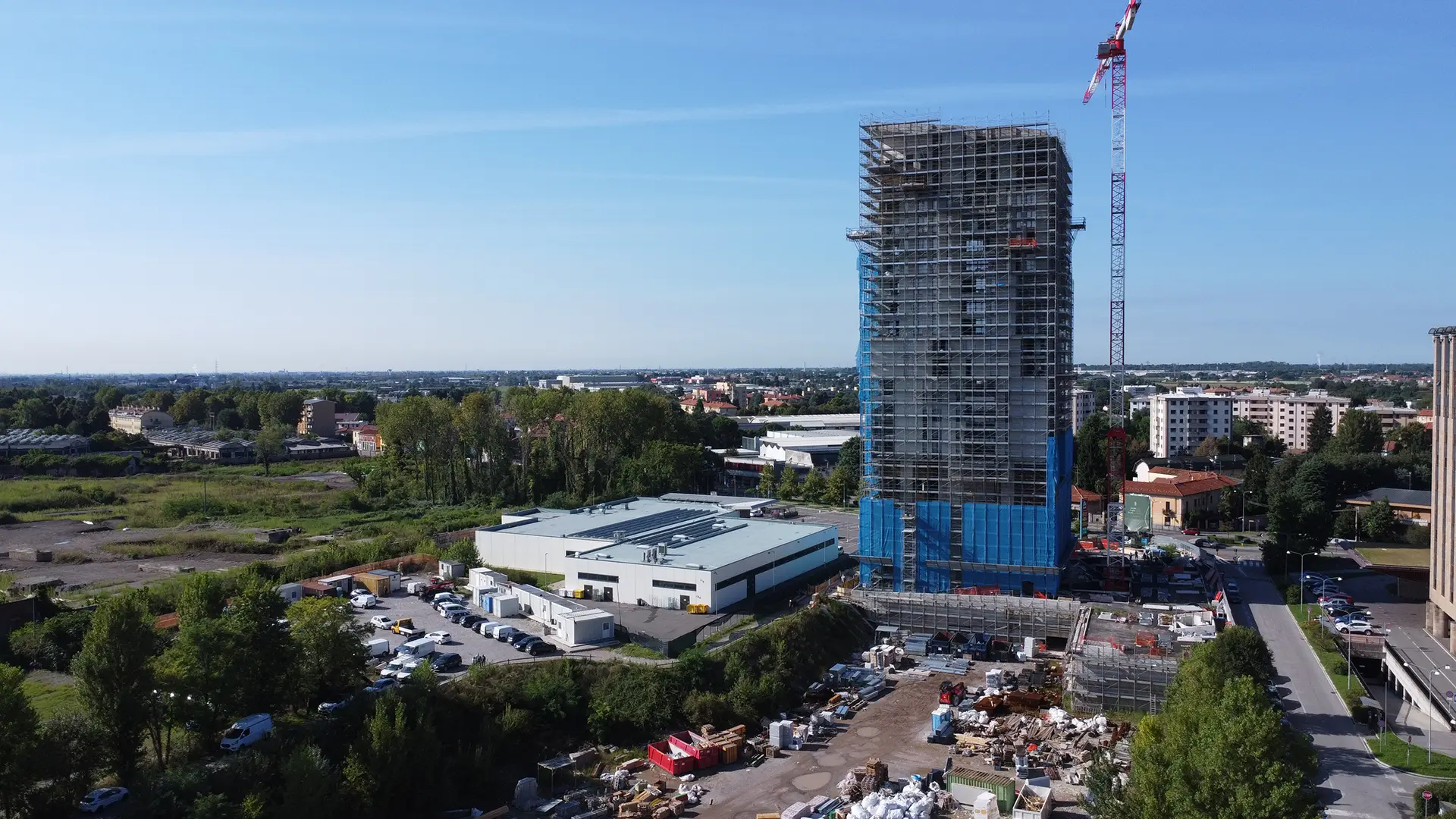 L’edificio ha raggiunto la sua altezza finale e la fase di costruzione in elevazione è terminata. I lavori proseguono con le fasi successive, che porteranno alla piena realizzazione dell’opera.
