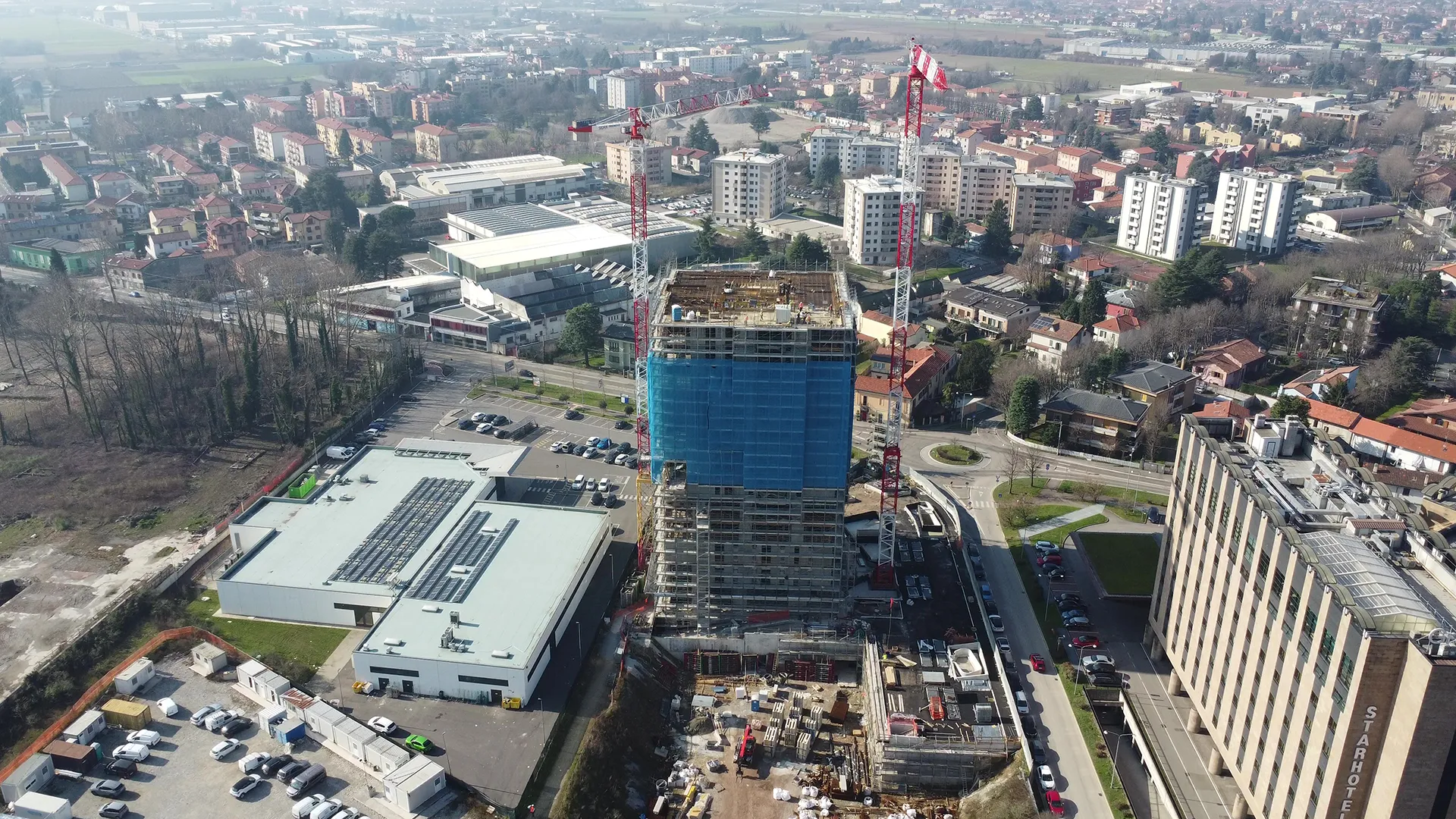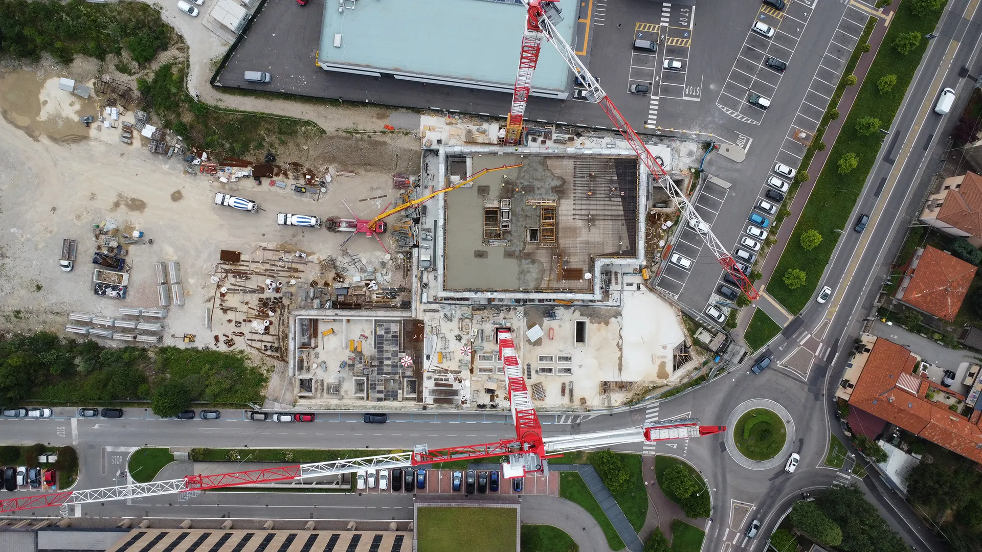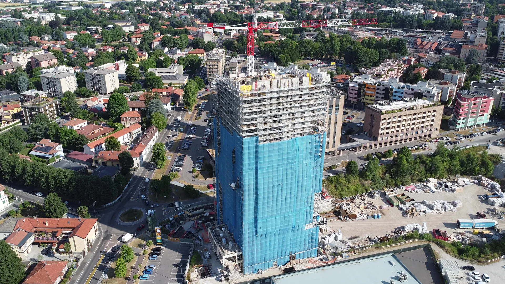 L’edificio ha raggiunto la sua altezza finale e la fase di costruzione in elevazione è terminata. I lavori proseguono con le fasi successive, che porteranno alla piena realizzazione dell’opera.