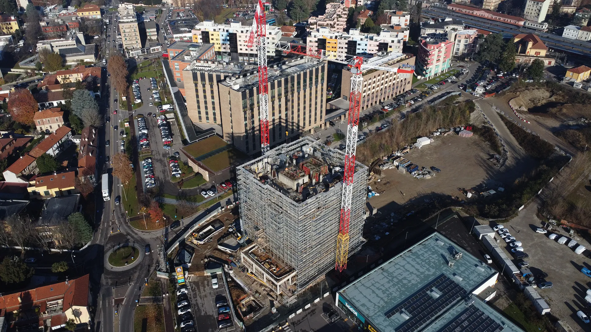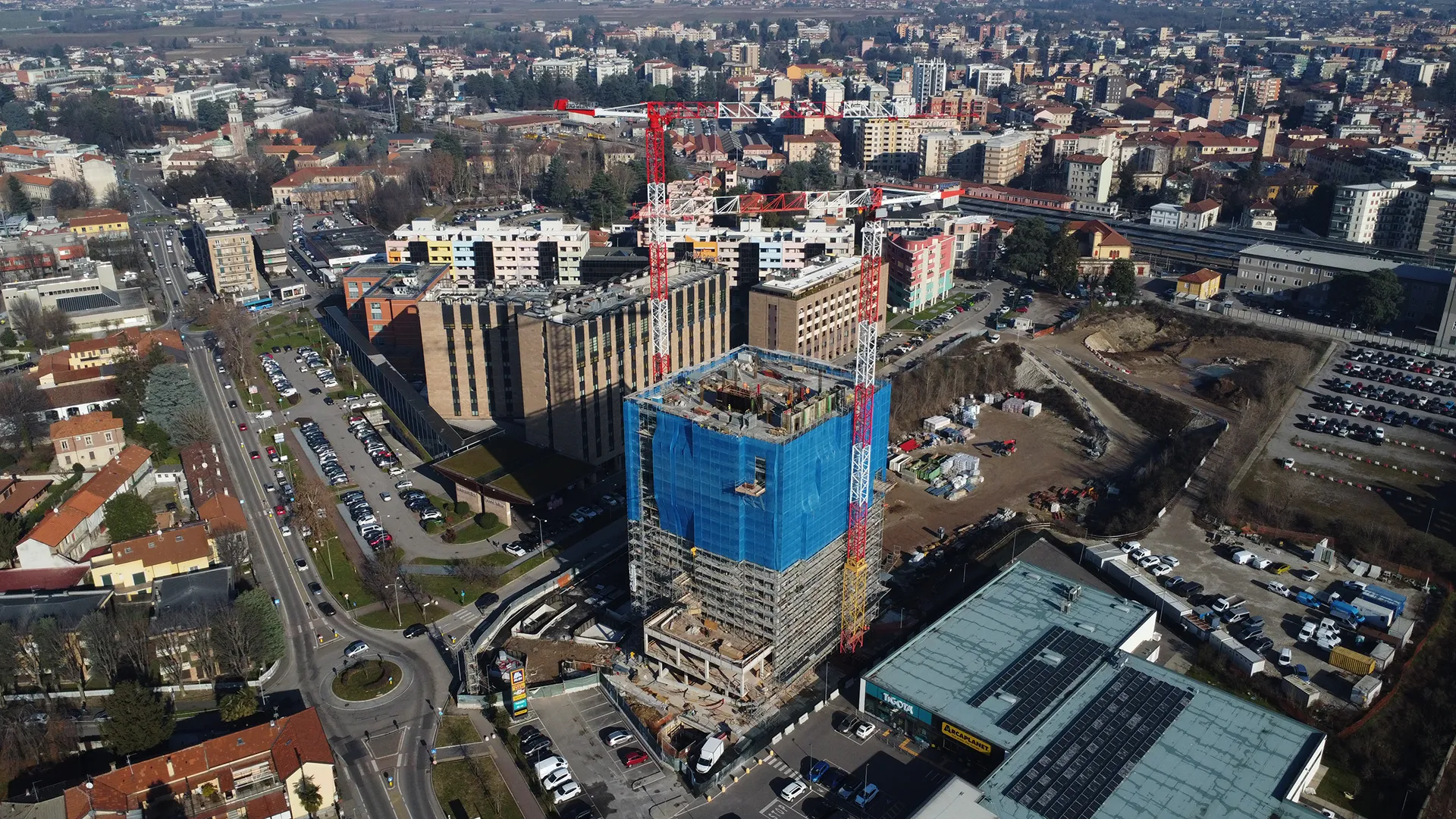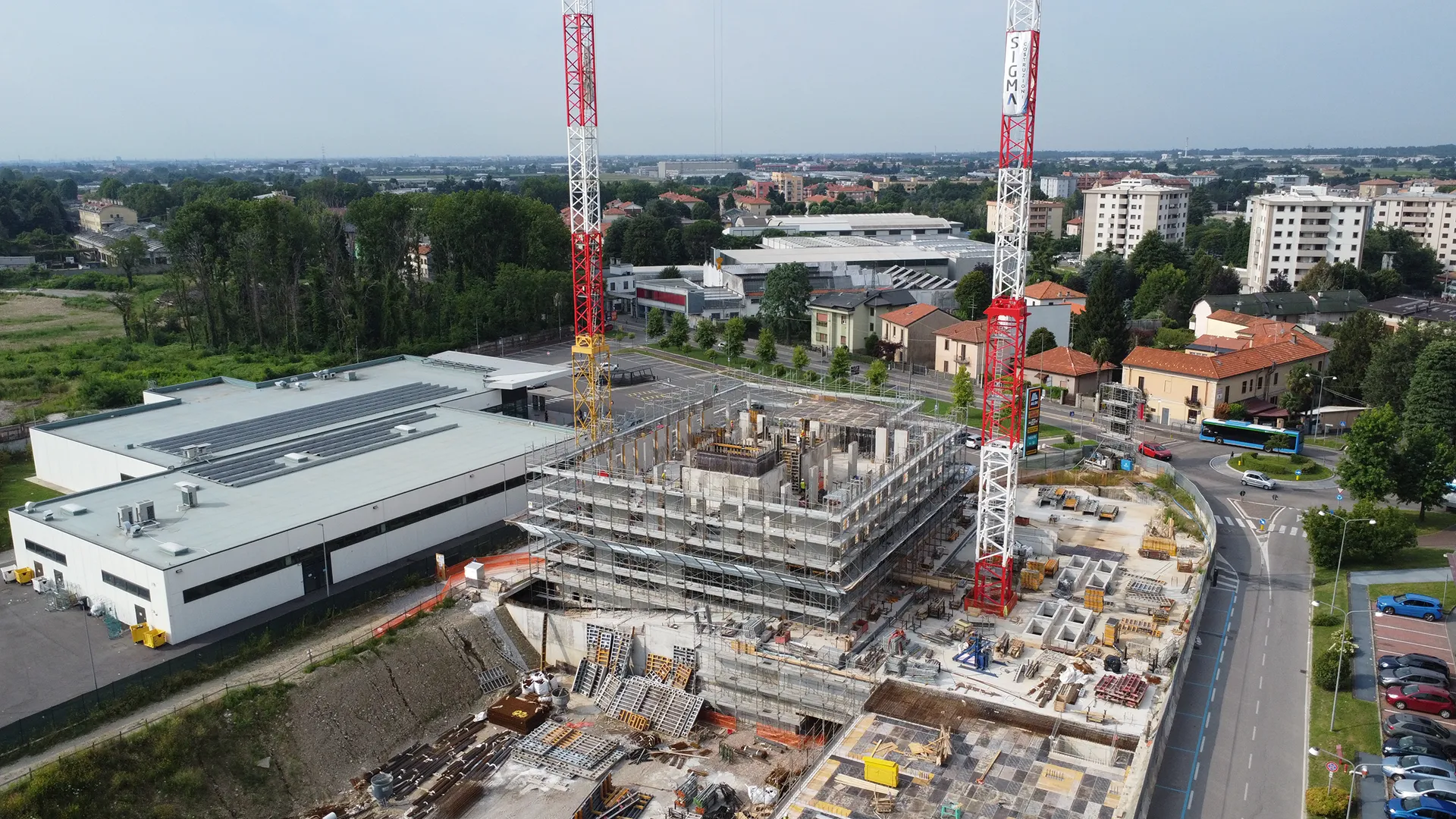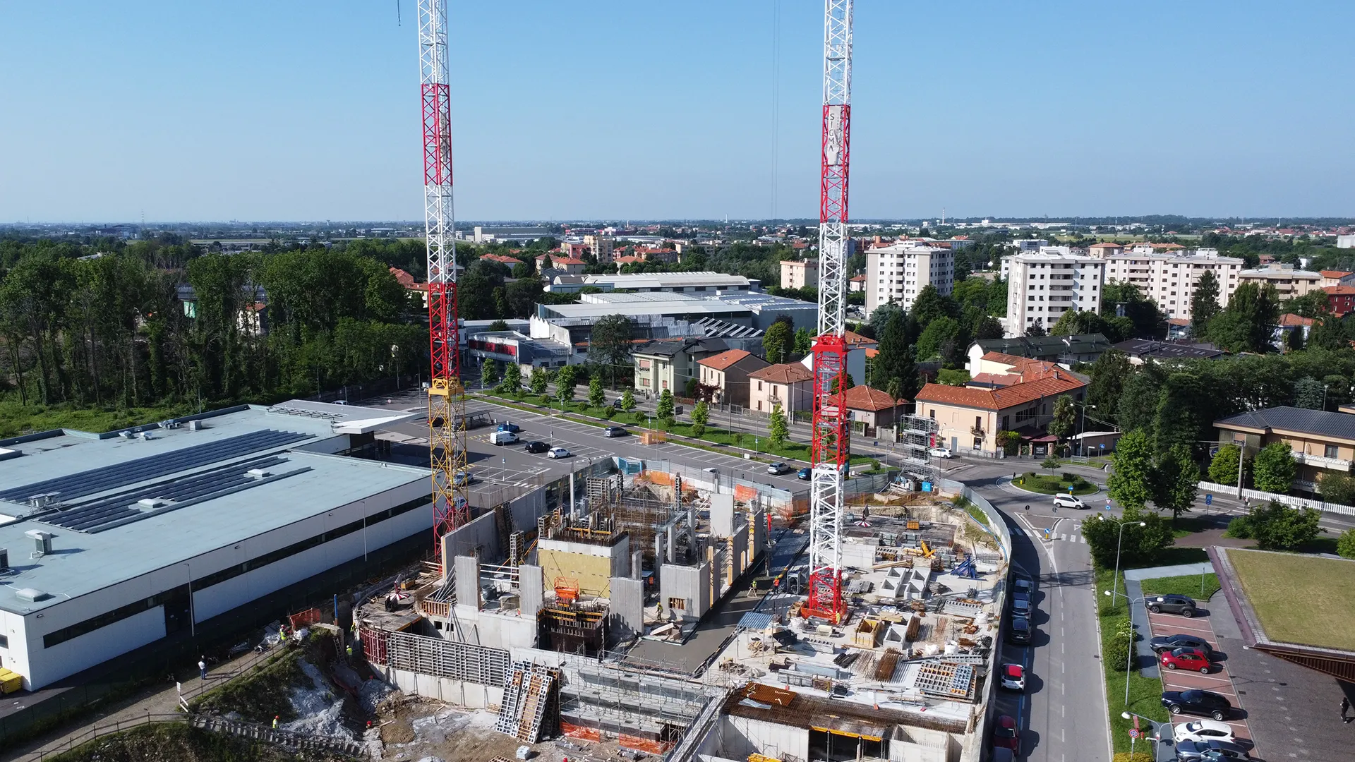L’edificio ha raggiunto la sua altezza finale e la fase di costruzione in elevazione è terminata. I lavori proseguono con le fasi successive, che porteranno alla piena realizzazione dell’opera.